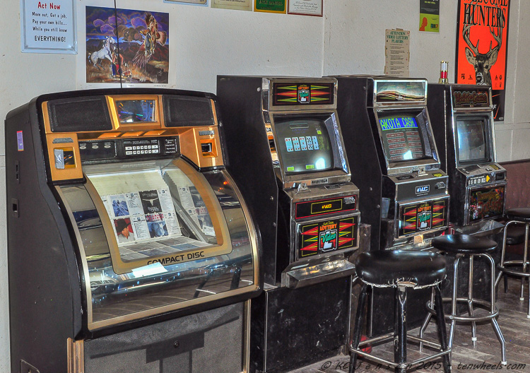 They did, from time to time, have live music and dancing, and used the stage you see here. Why the area is cluttered with a wagon, a hand truck, a kid's bike, a 4-foot Budweiser blimp, etc., is pretty hard to imagine. The place was full of curiosities like this, and as you can see there was a Juke Box and several games of chance. Also (mercifully not pictured here) the bathrooms looked like they might have been almost an afterthought, and the commode areas were little more than roughed in wooden stalls that had curtains instead of doors which you could draw closed for privacy. That part seemed a little creepy, particularly if you envision a big crowd on a weekend night.